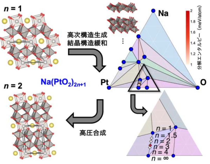 Platinum oxide has been widely studied as a functional material, and is utilized as a catalyst material to promote reduction reactions in a hydrogen atmosphere. On the other hand, as platinum is chemically stable and has low reactivity, it has been difficult to develop platinum oxides with new structures, and no homologous series layered materials have been known until now. In this study, by utilizing a high-pressure synthesis method accompanied by an ultra-high oxidizing atmosphere, the researchers succeeded in synthesizing single crystals of a novel layered oxide, NaPt₃O₆, with a two-dimensional rutile-type structure as the layer matrix. Furthermore, they designed materials focusing on the fact that the rutile structure is a dense structure that is advantageous for stability under pressure and byusing first-principles calculations they predicted the stability of NaPt₅O₁₀, a highly layered structure, and succeeded in synthesizing its single crystal under high pressure. This demonstrates that the complementary collaboration between computational science and solid-state chemistry is extremely effective in accelerating the development of new materials through high-pressure synthesis. In new materials discovered in this study, PtO₆ octahedra form two-dimensional rutile-type layers, with PtO planes forming one-dimensional chains between the layers. This is an unprecedented new homologous series of oxides, defined by the general formula Na(PtO₂)2n+1. This study not only provides a novel structure, but also a new platform for controlling the dimensionality of platinum oxides and exploring their physical properties. Furthermore, this approach is an effective strategy that enables the systematic exploration of unknown metastable phases, and the results provide an effective guideline for the development of new materials.