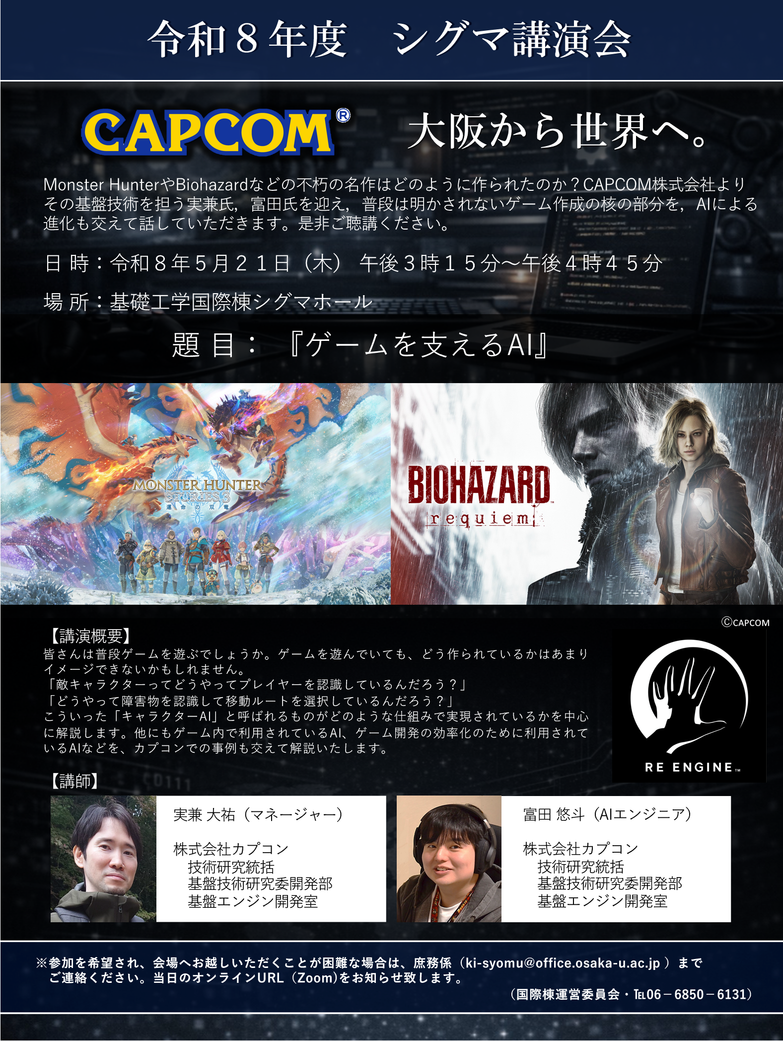 令和8年度シグマ講演会開催のご案内【5月21日(木)15:15~ 講師:株式会社カプコン 実兼大祐氏、富田悠斗氏】